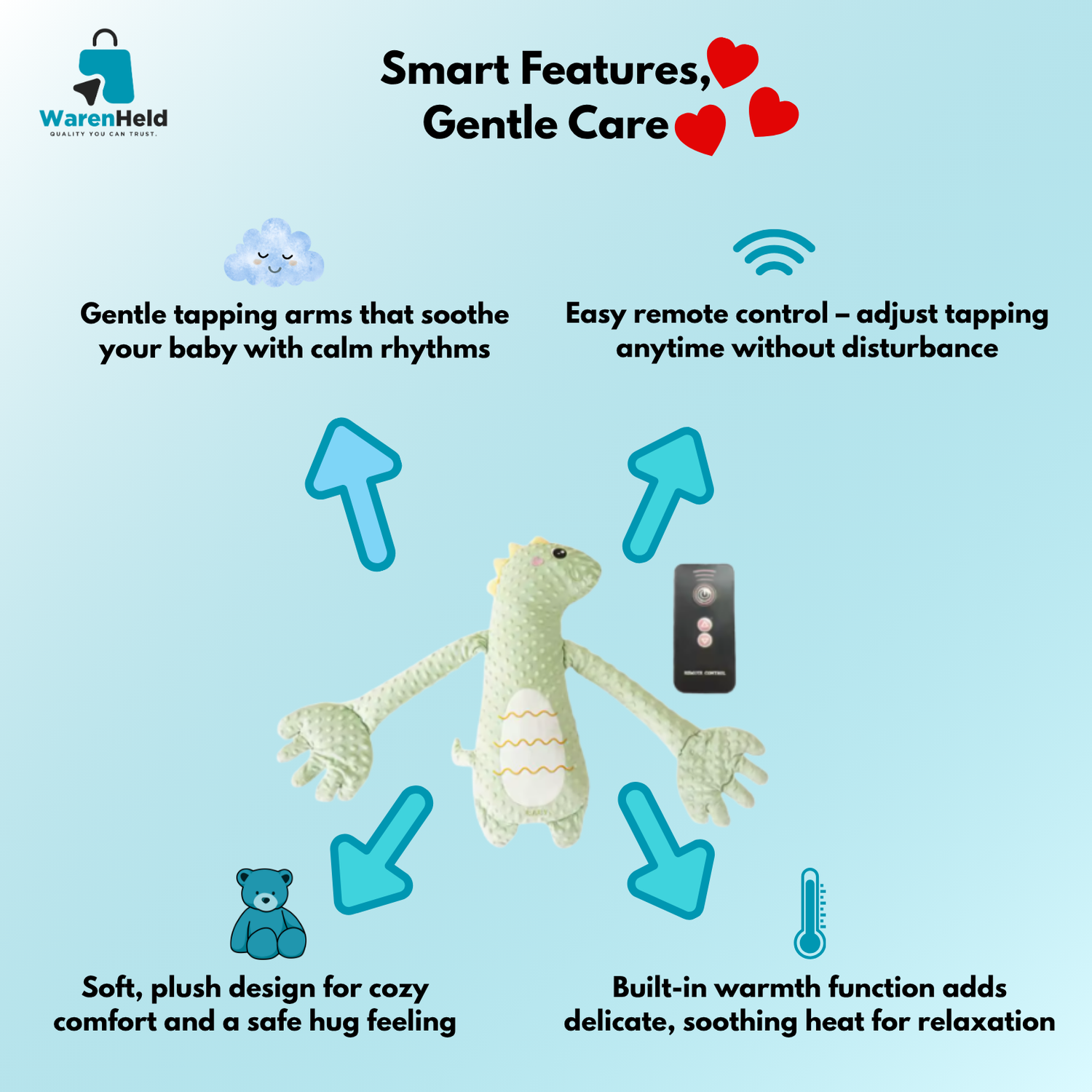 Every feature works in harmony: calming taps, delicate warmth and a plush embrace that turns bedtime into moments of peace and love.