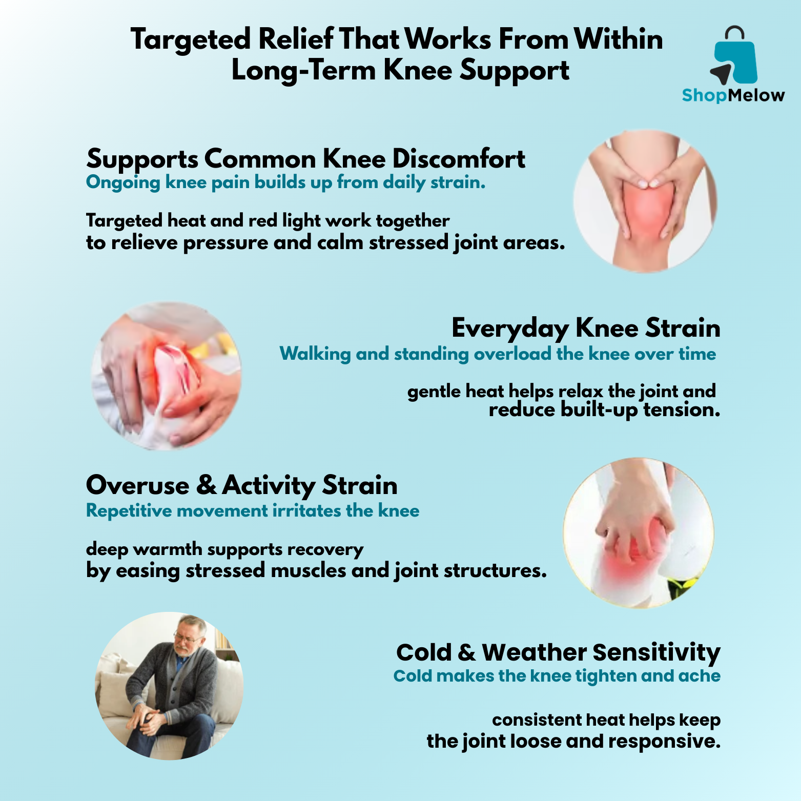 Uses targeted heat and red light to support circulation, relax deep joint structures, and help the knee recover from the inside over time.